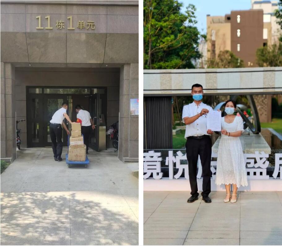 在8月18日這一天,鹿鳴湖壹號(hào)悅府小區(qū)有一位女士業(yè)主,因快遞太多,在帶著快遞到達(dá)小區(qū)西門后,小區(qū)的秩序領(lǐng)班王志輝和隊(duì)員王博正在門口執(zhí)行卡點(diǎn)任務(wù)。在看到業(yè)主帶的快遞后,主動(dòng)幫助業(yè)主進(jìn)行快遞的消殺。同時(shí)他們立即取來小區(qū)的便民服務(wù)車,將業(yè)主的快遞放置在車上,一直幫業(yè)主送到門口。
